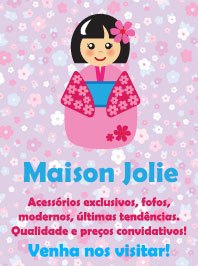 A Maison Jolie é uma loja virtual que trabalha com acessórios exclusivos, modernos e super fofos! Além disso, a Maison Jolie está super antenada nas tendências da moda!A loja é administrada por 3 amigas, Renata, Gabu e Érika que disponibilizam na rede as melhores peças para completar o visual de toda mulher moderna e descolada.